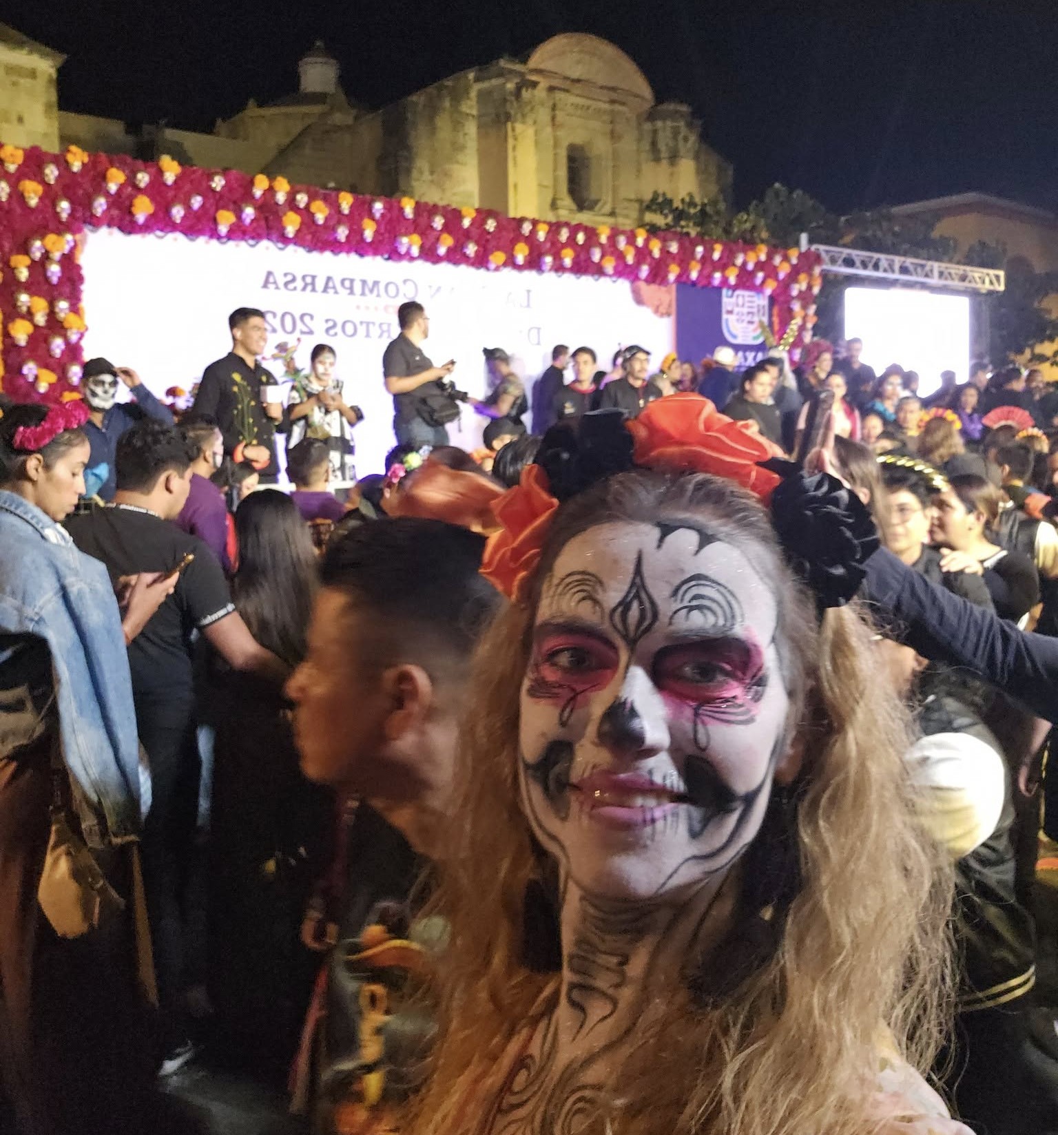 Išsipiešusios ir su karūnomis keliaujame į fiestą. Išdalinu ant kaklo pakabinamų bambukinių taurelių. Tokiomis pasipuošti meksikietiškoje fiestoje praktiška - nepamesi ir praeiviai vieni kitiems jas pripildo. Atvykusi supratau, kad pusvalandžio pavėlinimas labai pasiteisino. Pataikome tiesiai į šventinį paradą. Nesibaigianti eilė orkestrų, dekoruotų skeletų, gražuolių ir balsuoklių, šokančių gaisrininkų, studentų ir pensininkų kolektyvų. Žiūrime išsižioję apie valandą. O aš laiminga, nes per trejus metus karnavalas pats įspūdingiausias. Vyksta gyvenimo ir mirties orgija. Vėliau keliavome pėsčiųjų gatvėmis, per turgus į centrinę aikštę. Vienai keliautojai bėdelė su nugara, sunku eiti, o teks grįžti visą kelią, nes eismas visur uždarytas, autobusas neprivažiuos. Variantų nėra daug, tad pasodiname tiesiog aikštėje ant bortelio. Paprašau Jaimes patikrinti aplinkinius ir barus ir stebuklas - jis rado laisvų vietų! Su pailsėjimu pareiname iki autobuso.