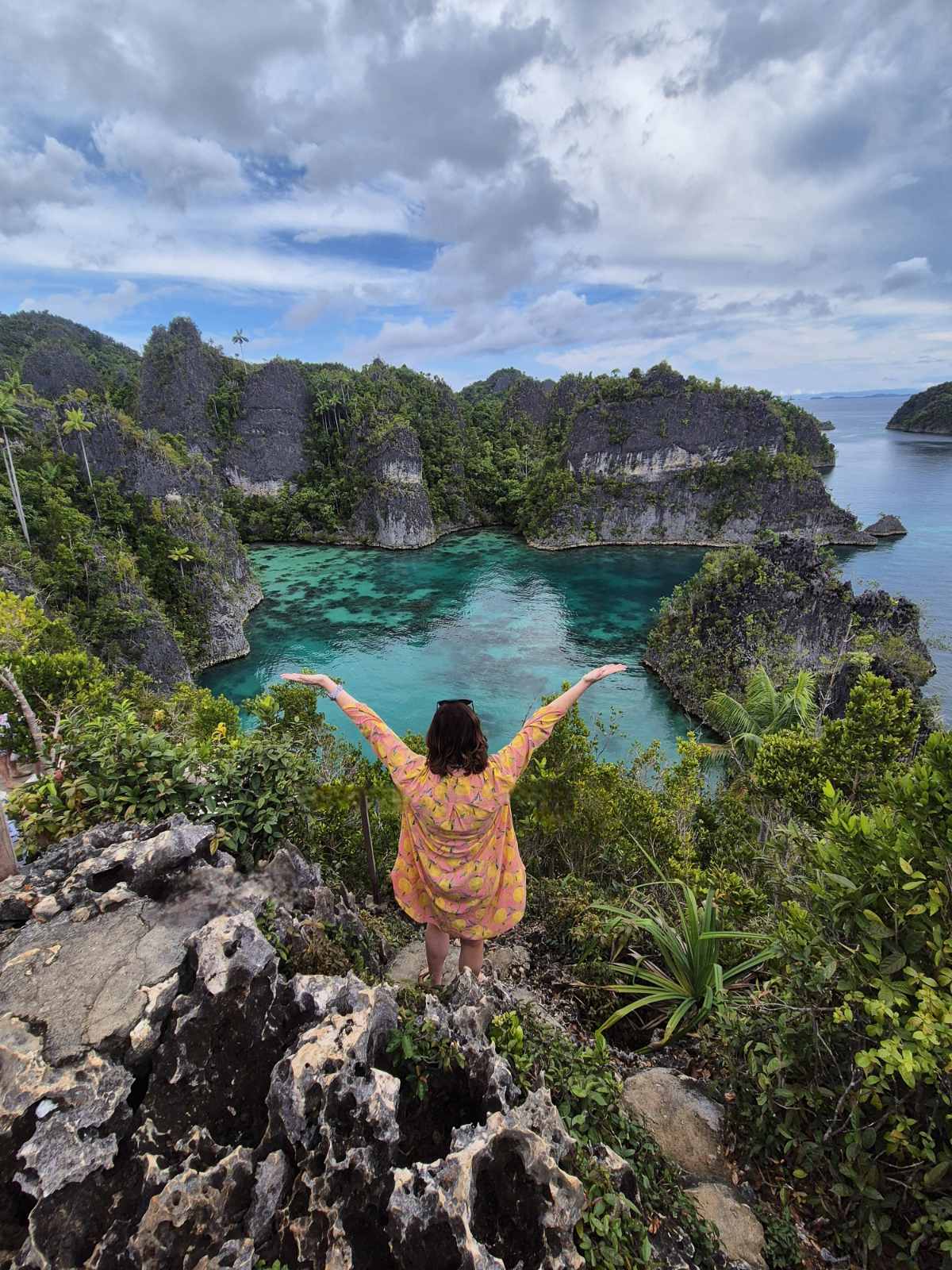 Tada pagrindinė Pjanemo apžvalgos aikštelė, kur kopti aukščiau, bet mediniais laiptais. Viena pora lieka laukti apačioje, o mes visi apsipilame prakaitu, kol užlipame. Gerai, kad nuotraukos iš toli, nesimato, kaip prakaitas graužia akis Nusileidę pasistipriname kokosais, kava ir sausainiais, tada plaukiame šalia į pirmą snorklinimo vietą. Įlanka nedidelė, bet ir vėl fantastiška. Paduodu gidui savo gopro, kad nufilmuotų žuviukus Nemo iš arti. Plaukiame pietauti. Raja Ampat salyne be galo daug visokių apleistų namukų, prieplaukų, kurios tinka tokiam pusiau laukiniam sustojimui. Ne tik pavalgone patys, bet ir pašeriame šunis bei žuvis. Antroji snorklinimo vieta čia pat. Srovė švelniai neša pro koralus, o žuvys, atrodo, net pačios į kamerą lenda.