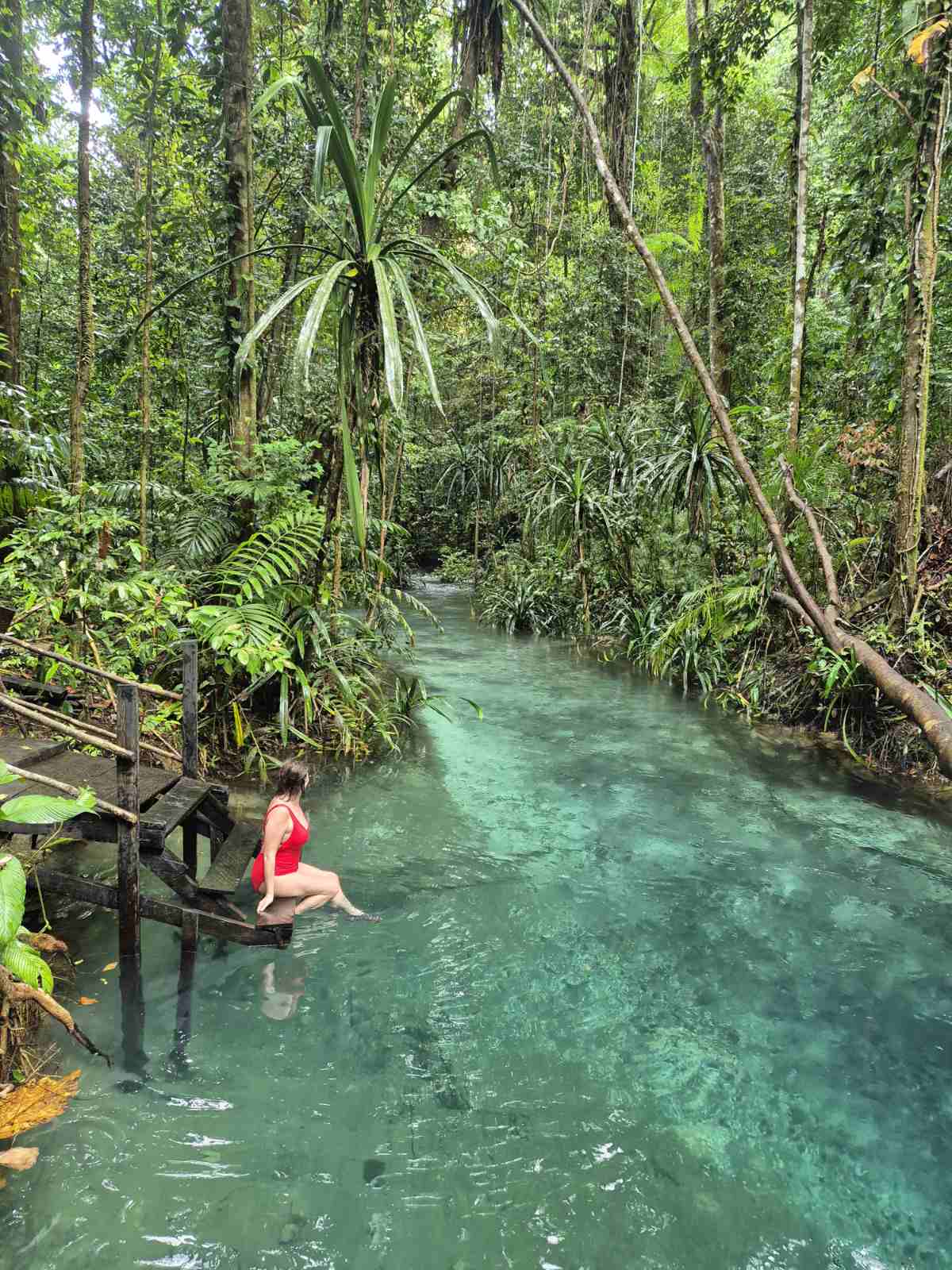 Plaukiame apie valandą, švartuojamės vietiniame kaimelyje. Mus pasitinka pagal senas tradicijas išsipiešusi šeima. Apsilankymas tualete ir persirengiu į kitą maudymuką. Susėdame į dvi mažesnes valtis ir plaukiame link šios dienos pagrindinio tikslo - Kali Biru arba Mėlynosios upės. Už salos kalnų užkliuvę lietaus debesys nusprendžia mūsų nepasigalėti. Vakar dievams nieko neaukojome, tai gauname gerą dušą. Mano sausas maudymukas šlapias, kaip ir visa kita, kas buvo krepšyje. Bet mes optimistai, žygiuojame per akmenuotos upės seklią srovę ir vargo nematome. Kadangi šilta, tai labiau atgaiva, nei bėda. Blogiau būtų, jei atėjus upė būtų drumsta ir ruda. Kadangi saulė per debesis, tai upės ryškaus mėlynumo nėra, bet vaizdas ir taip toks nuostabus, kad visi kaifuojame.