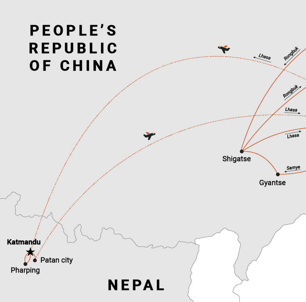Skrydis iš Vilniaus į Katmandu su persėdimu Stambule vienomis geriausių Europos oro linijų „Turkish airlines“. Ryte atvyksite į Katmandu ir pradėsite tvarkyti Tibeto vizos formalumus. Vakarop aplankysite Svajambu stupą – vieną seniausių ir švenčiausių budistinių šventovių Katmandu slėnyje. Vakare eisite pasivaikščioti senamiesčio gatvėmis pažinti spalvingojo ir triukšmingojo Thamelio šurmulio. Nakvynė viešbutyje Katmandu.